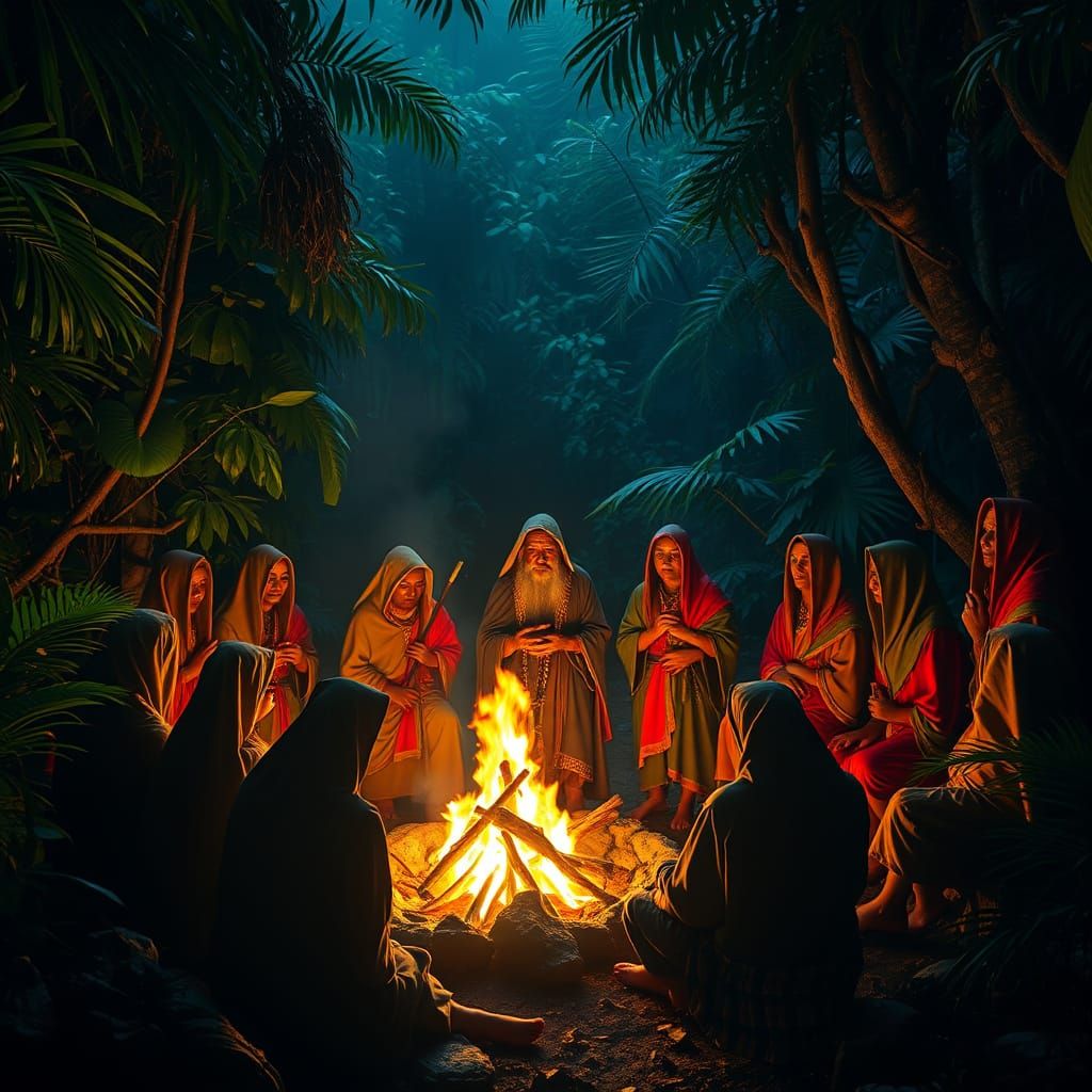 This vibrant, detailed painting depicts a group of robed figures gathered around a glowing fire, surrounded by lush foliage, participating in an Ayahuasca ceremony under the guidance of a wise shaman, with enchanting icaros and an otherworldly energy filling the night air, in a fantastical, high-realism ...