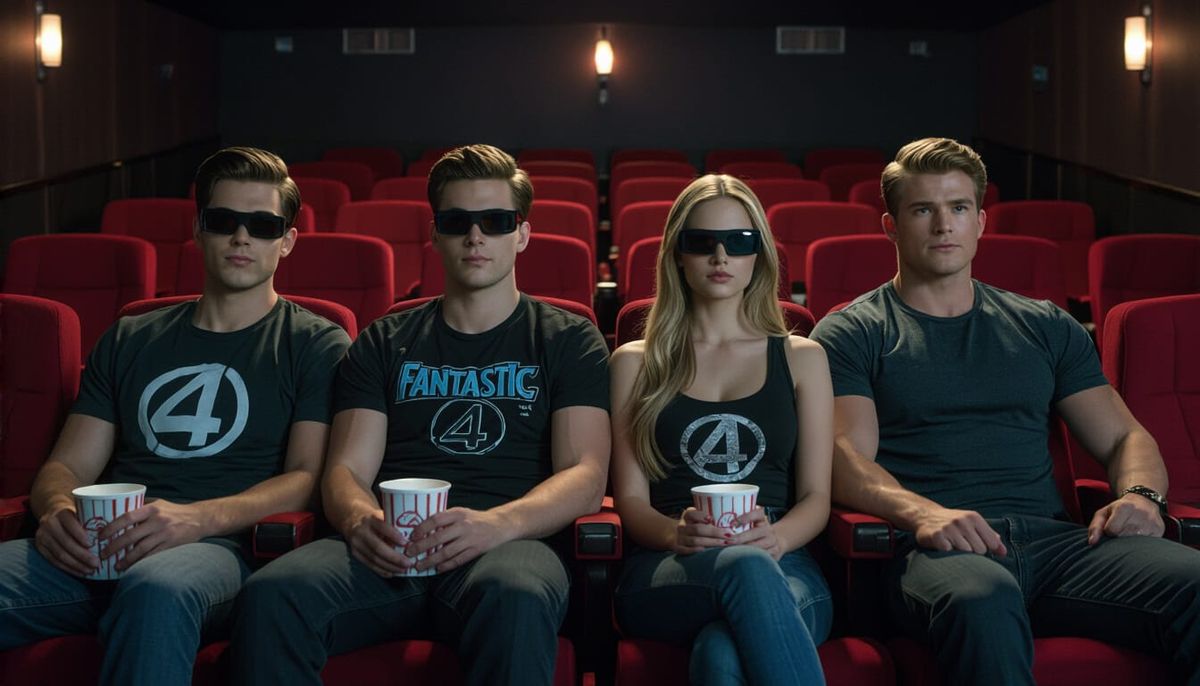 A cinematic image of four stylish young people watching a film in a modern movie theater with red seats and dim lighting. The group wears 3D glasses, bathed in blue and red light. The image evokes a film still aesthetic.