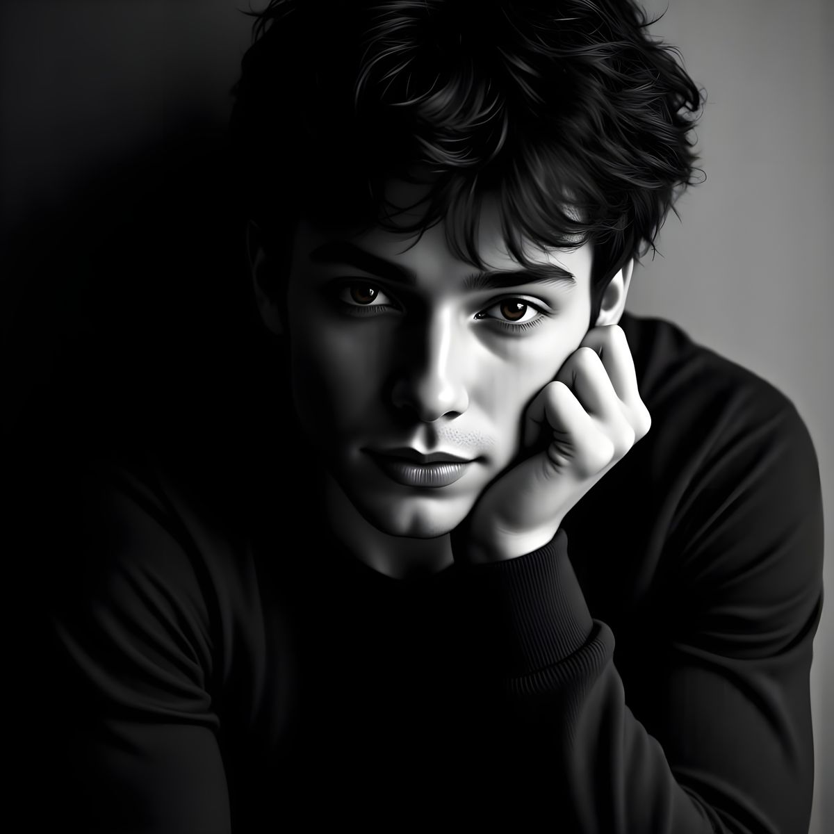 Easily generate unique monochromatic portraits of young men with dark, curly hair. Try it free!