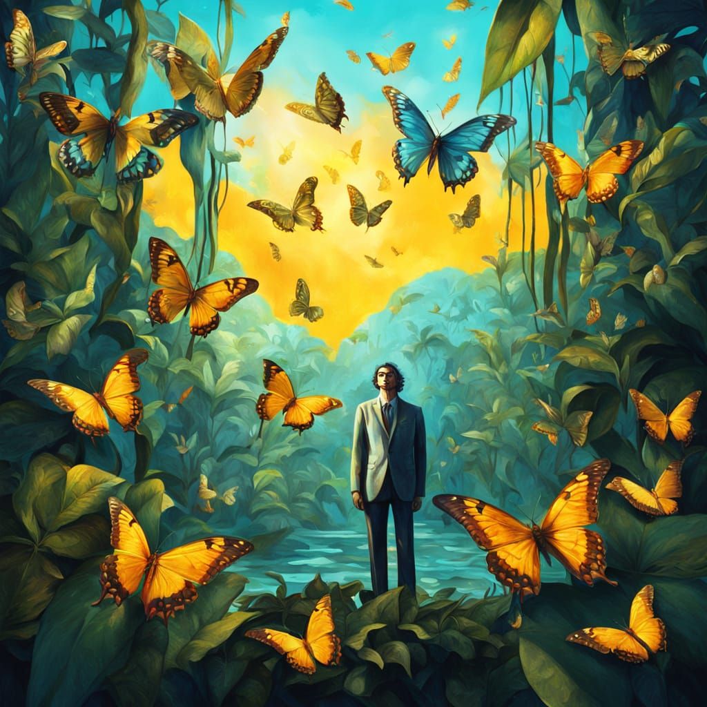 This hyper-realistic oil painting captures a man amidst vibrant, melting butterflies in a dappled jungle. The warm, golden color scheme and intricate details create a dreamlike masterpiece.