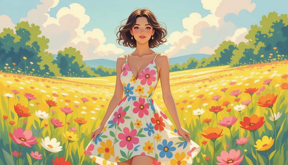 A vibrant image of a woman in a floral dress in a sunny, flower-filled meadow. The picture captures a whimsical pop art style with hyper-detailed textures and soft, natural lighting.