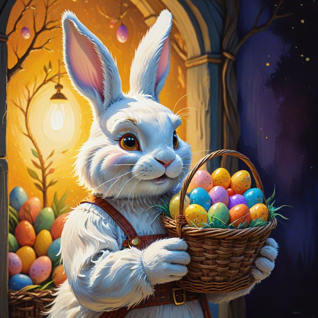 This vibrant, textured painting depicts an Easter bunny holding a colorful egg basket in a dreamlike, Impressionist style with thick brushstrokes and golden lighting.