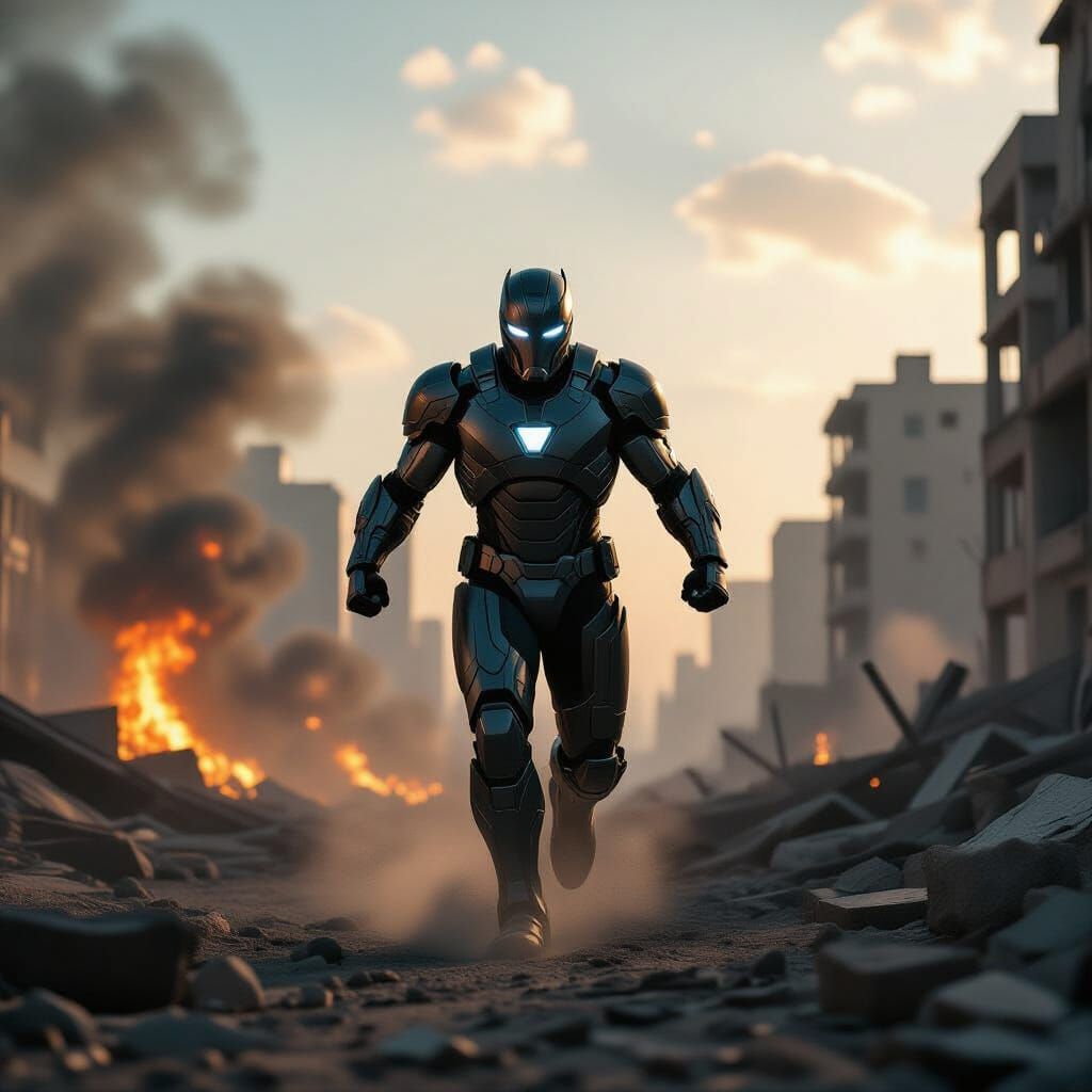 A superhero in metallic armor makes a dramatic landing amidst a ruined city engulfed in smoke and fire. The cinematic shot features enhanced lighting and a film aesthetic.