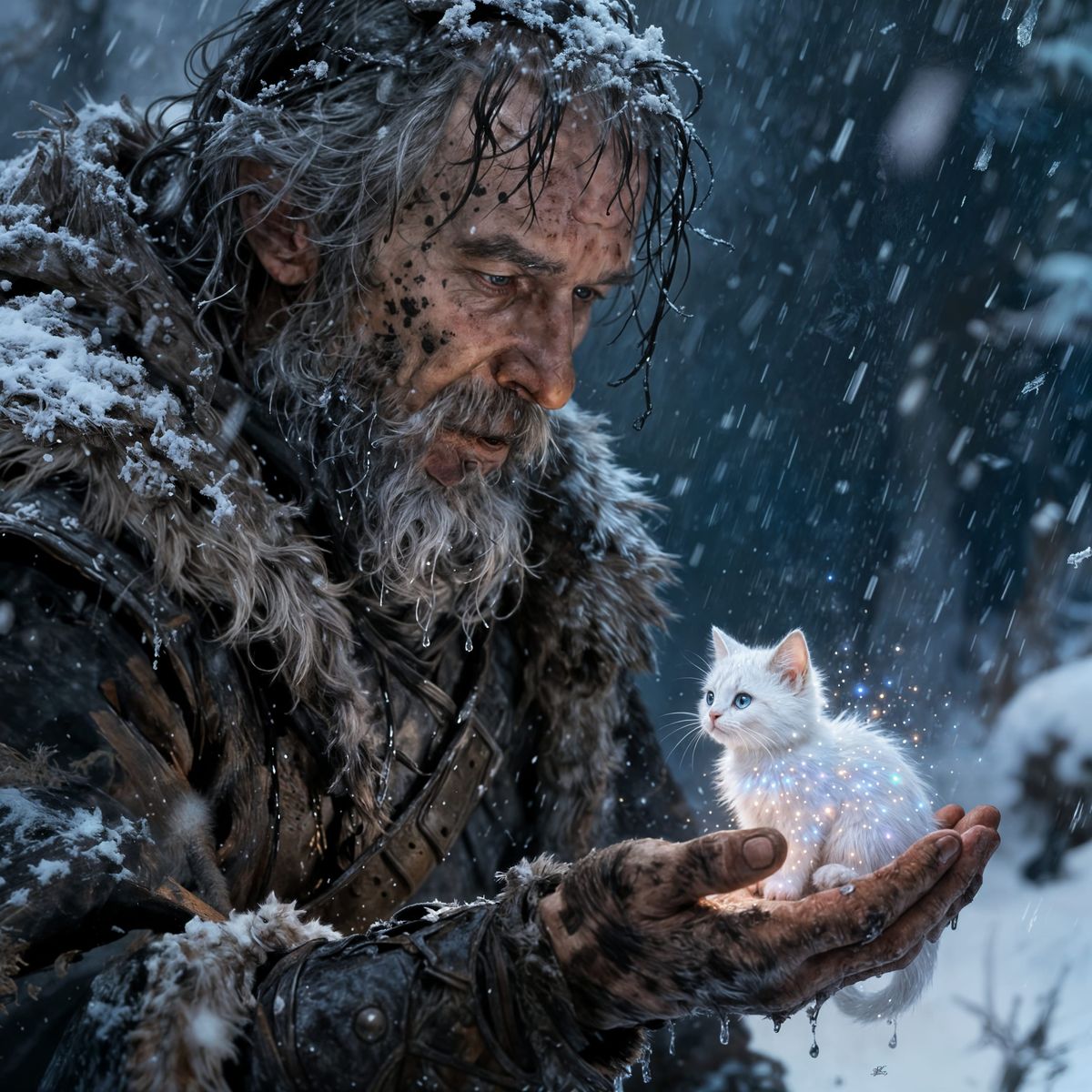 An old warrior, wet and covered in dirt holding a tiny cute sparkling white cat in the palm of his hand, heavy snowstorm, messy hair, fur coat, beard, frost, rough paint strokes, dramatic scene, intricately detailed matte painting, insanely detailed, splash screen, deep colors, tension and harmony