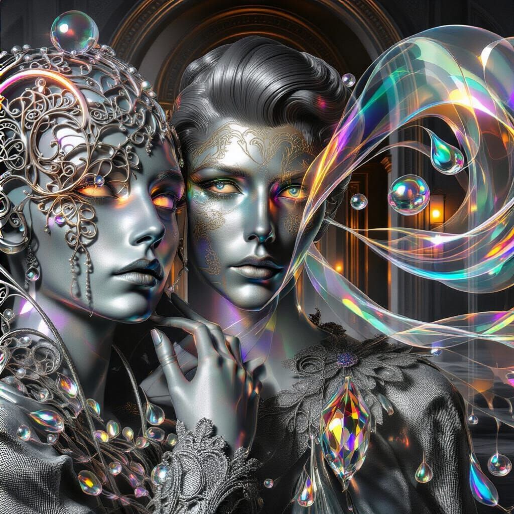by glass artist "gilded tenebrism" art deco style living paradigm marbleous afterglow the overall effect is a stunning, 3D chiaroscuro a futuristic fantasy scene with a surreal atmosphere. transparent vivid warm colors iridescent hylozoic techno-constructed celtic lace flowing, transparent cloth, ...