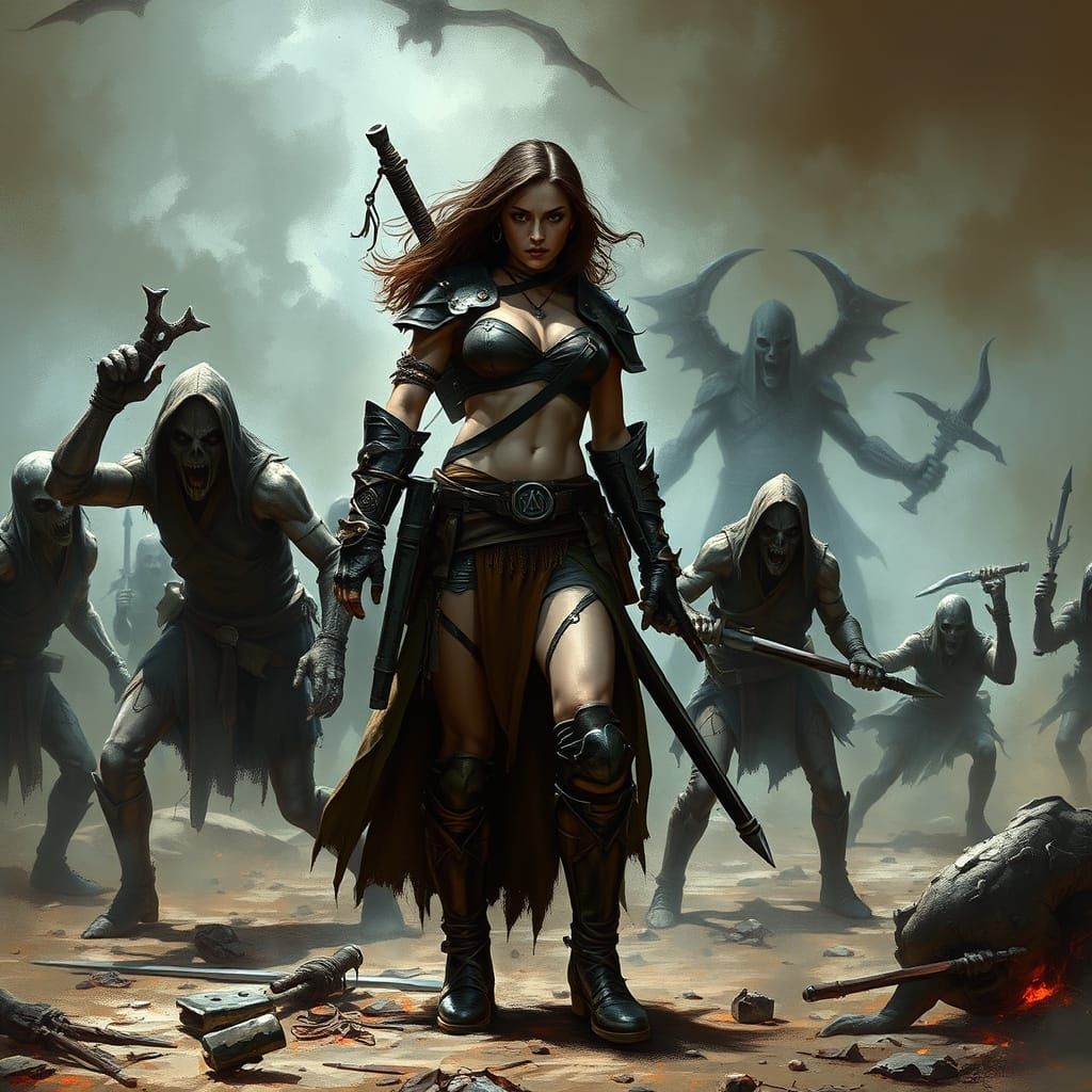 This image shows a bare-chested woman in leather armor standing on a dark fantasy battlefield, surrounded by zombies. Ormos and Balthor fight in the background in a gritty, realistic style.