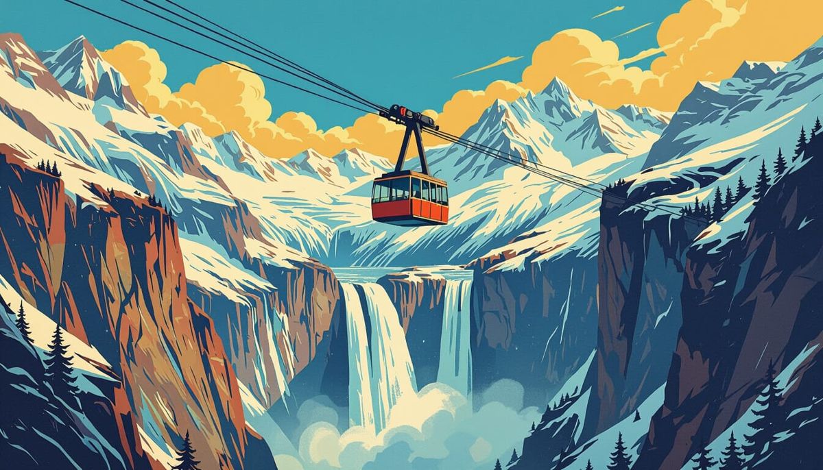 This image shows a vintage Swiss cable car above a dramatic alpine waterfall, rendered in a detailed illustrative style with retro travel poster aesthetics.