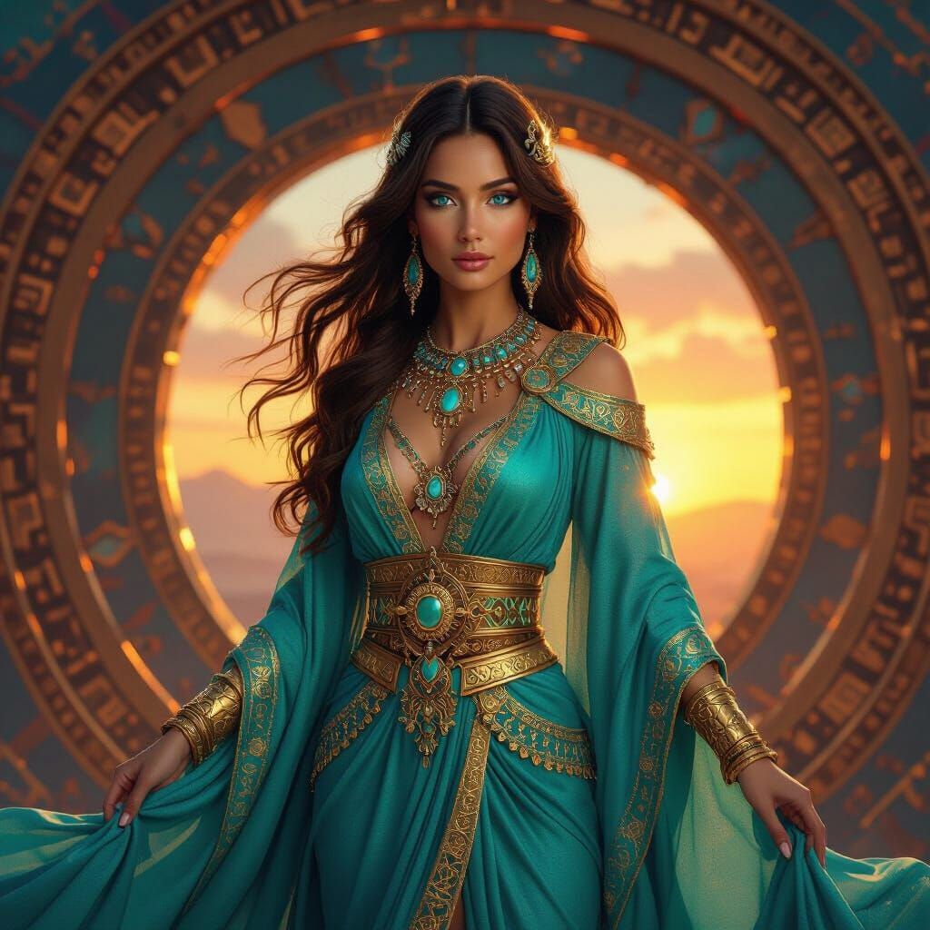 Draped in turquoise and gold, she stands like a queen of myth and light. Intricate jewelry and flowing fabrics shimmer beneath a celestial sunset, blending fantasy elegance with regal, timeless beauty.