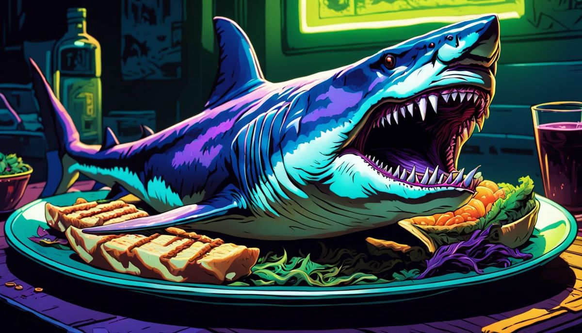 This image shows a close-up of a megalodon shark presented on a food plate. The artwork is rendered in a fluro-zombiecore aesthetic with vibrant neon colors, sharp details, and dramatic shadows.