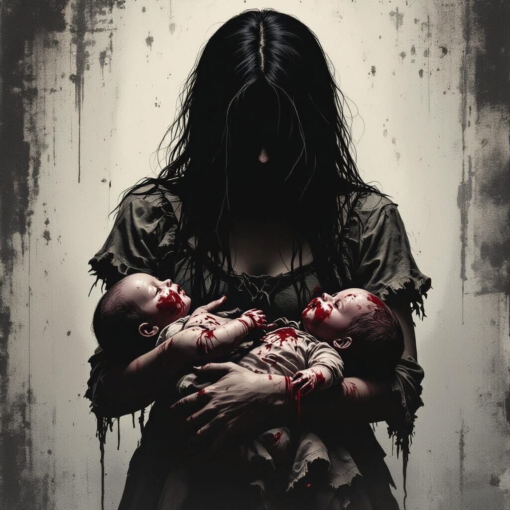 This image shows a silhouetted female figure in a torn dress, cradling a bloodied doll. The scene is set against a dark, industrial backdrop, creating a haunting, grunge-inspired aesthetic.