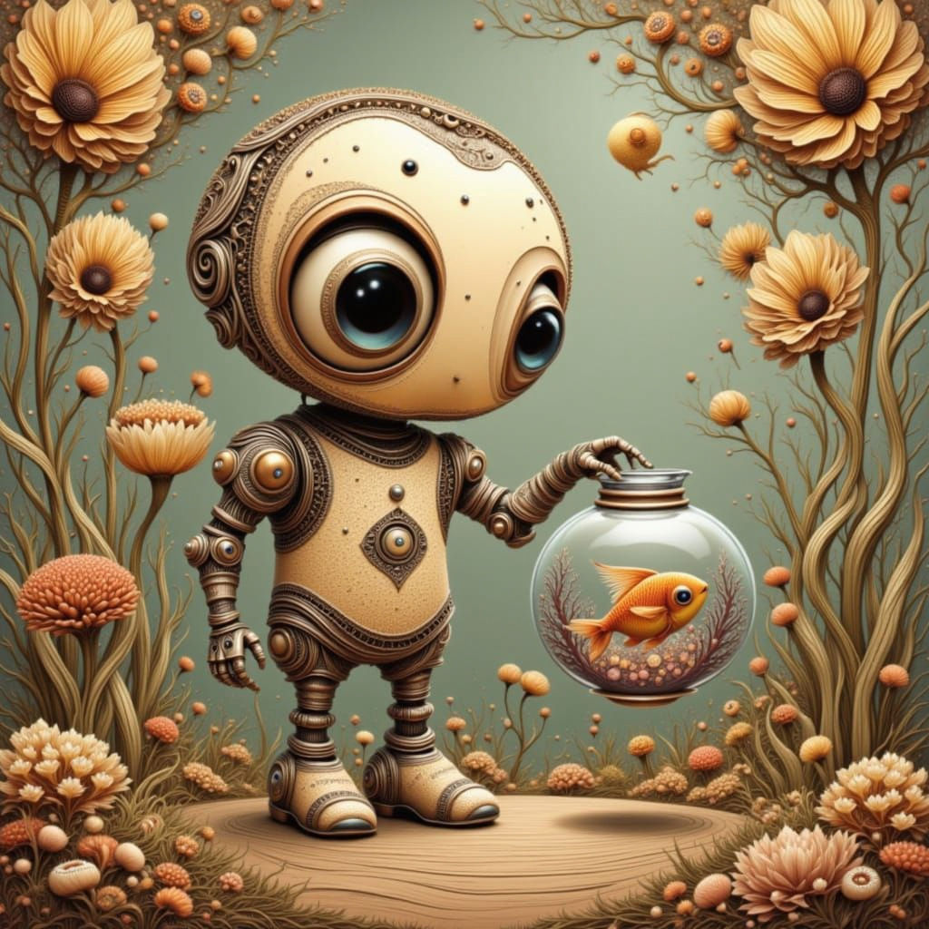 This image depicts a charming robot carefully holding a clear fishbowl containing a single fish. The artwork features a sweet, endearing aesthetic.