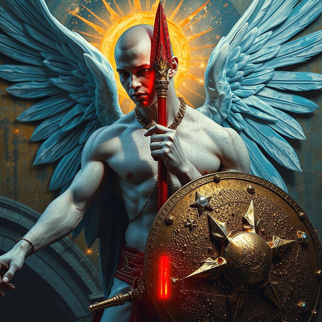 This image showcases a high-relief angel with a muscular build, dressed in a dazzling outfit featuring electric blue and gold glitter, set against a backdrop of contrasting colors and luminous effects, as if part of a surreal, immersive concept art piece