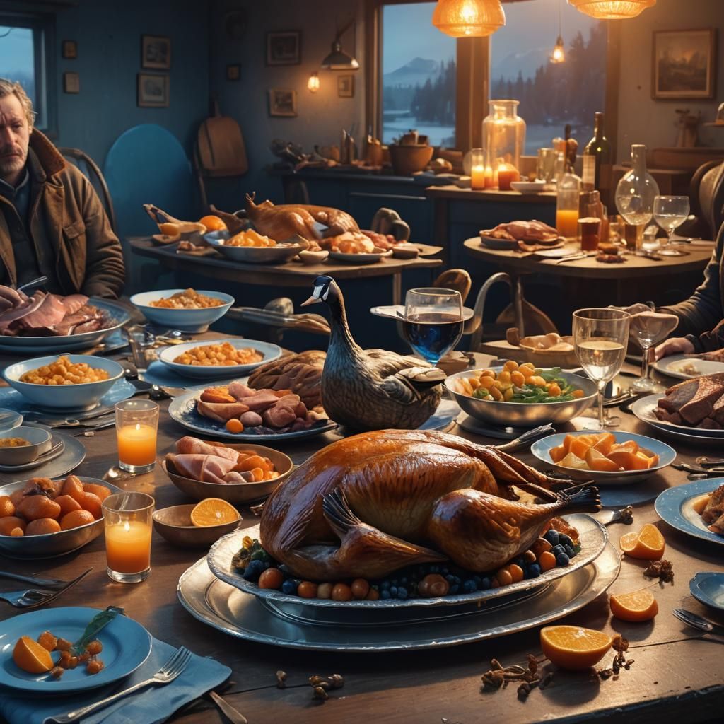 A detailed matte painting of a whole roasted goose centerpiece on a silver platter. Hams are visible in the background on a long table, bathed in warm, golden light with soft bokeh.