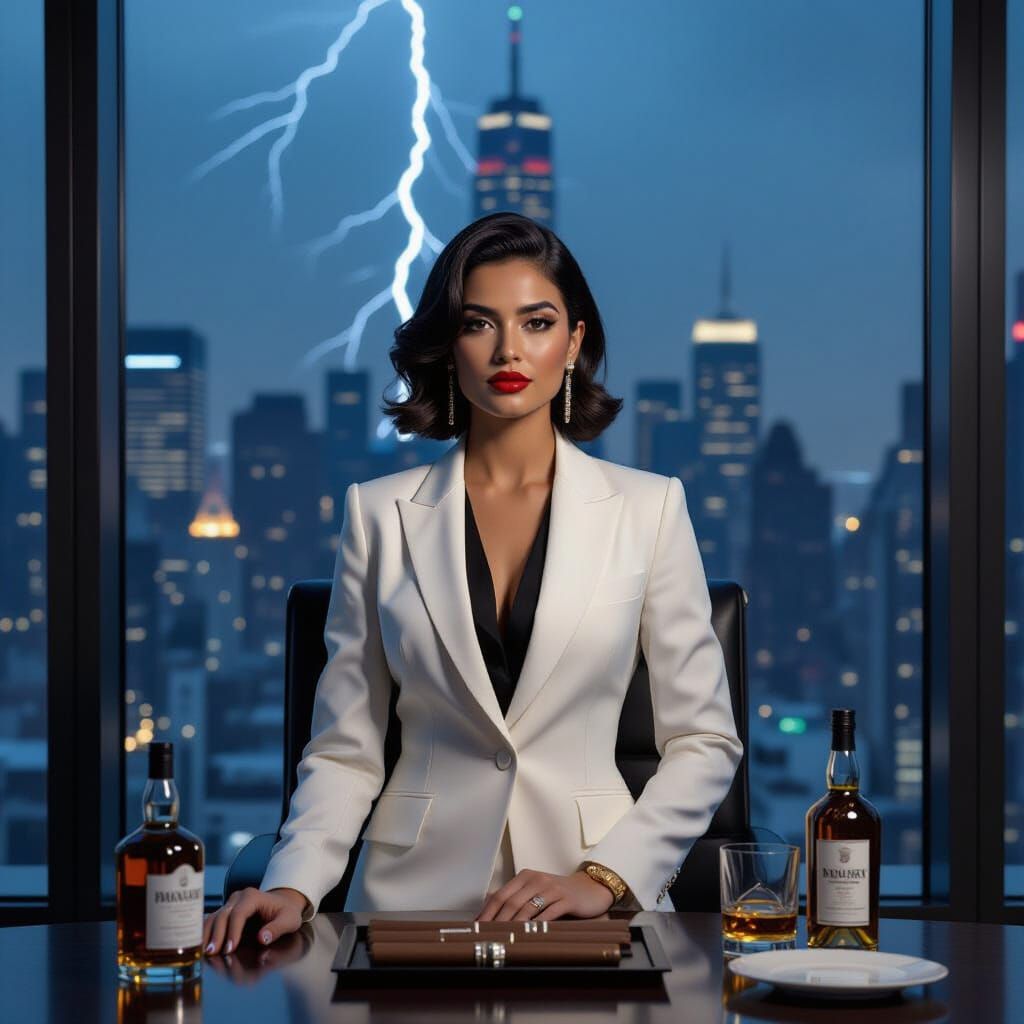 A striking picture of a young woman in a white business suit standing in a corporate boardroom. The scene includes whiskey, cigars, and a cityscape at night with a hyper-realistic style, sharp contrast, and electric color palette.