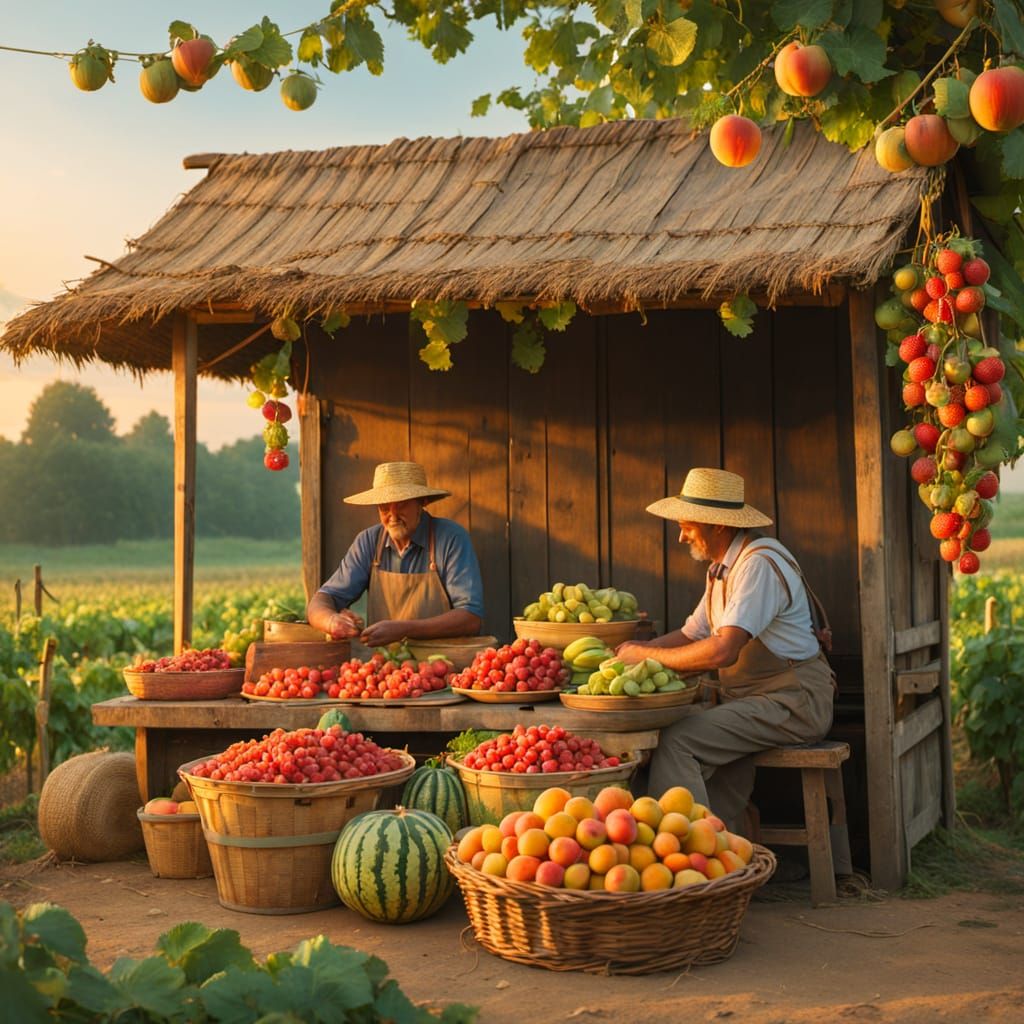This image shows a farmer's market stall laden with summer fruits and vegetables at sunset. The image is rendered in an impressionistic style, with warm colors and vibrant details.