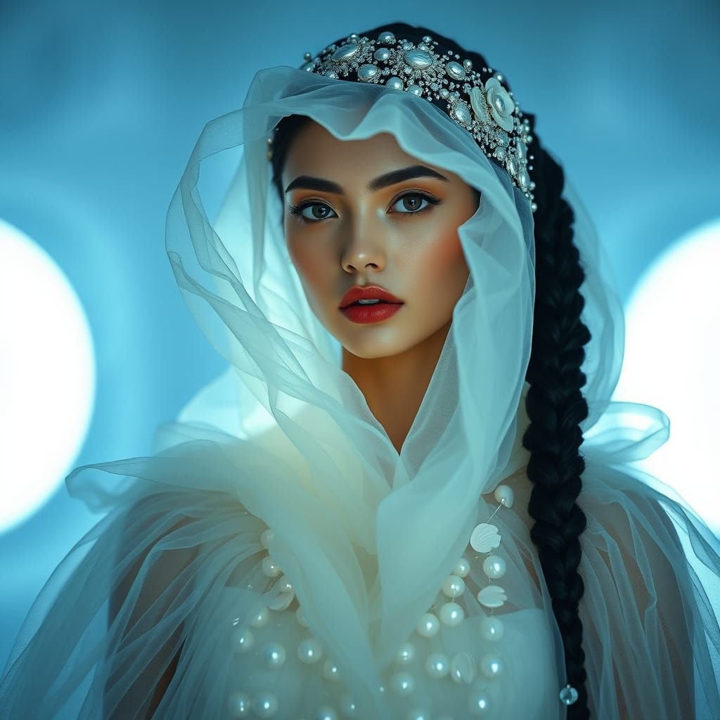 A stunning model stands poised, enveloped in a majestic, tulle cape with delicate, luminescent folds and shimmering moonlit glow, adorned with luminous pearls and iridescent shells, and an ornate, surrealist headpiece