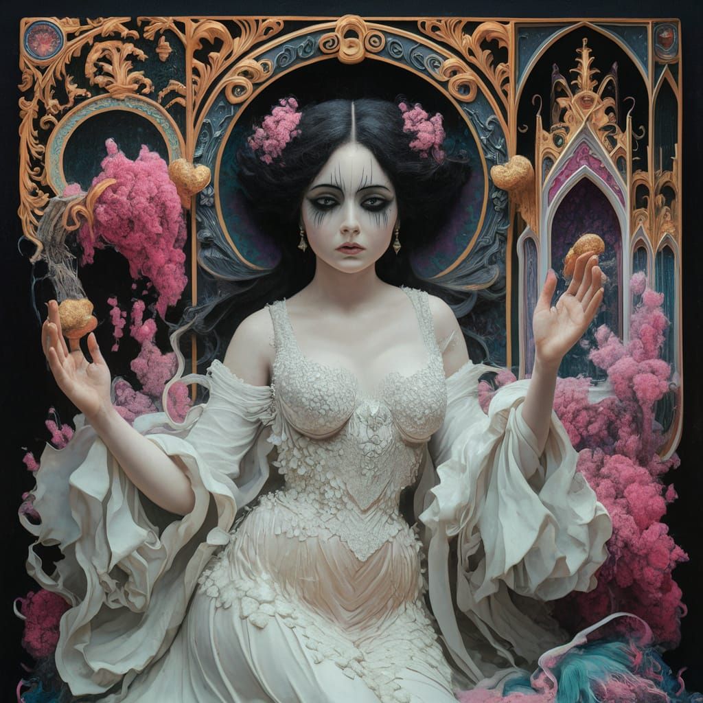 A surreal gouache painting of an emo Aphrodite, goddess of love, with dark hair and heavy eye makeup. Rococo and Gothic architecture surrounds her in vibrant colors, creating a melancholic, Art Nouveau aesthetic.