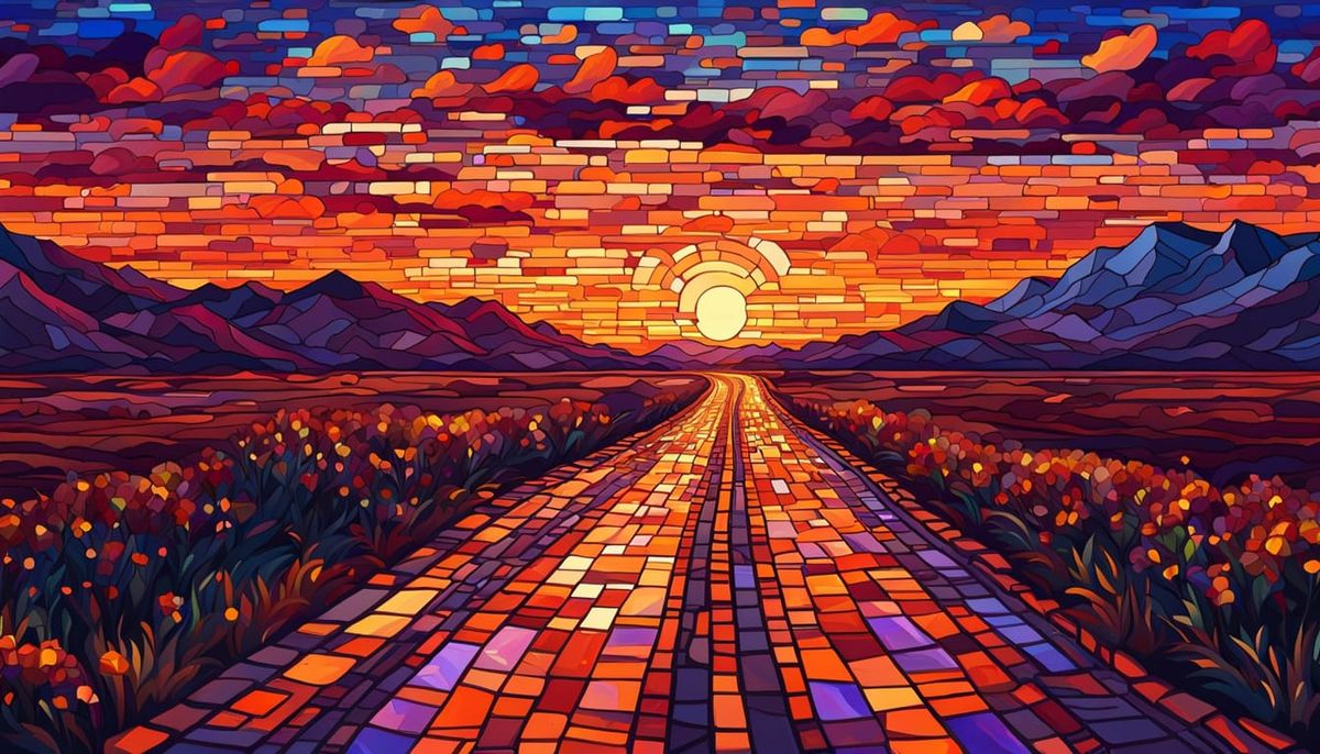A striking picture of a surreal landscape featuring a long road stretching to the horizon at sunset. The image is in a stained glass mosaic style with fiery oranges, reds, and purples.