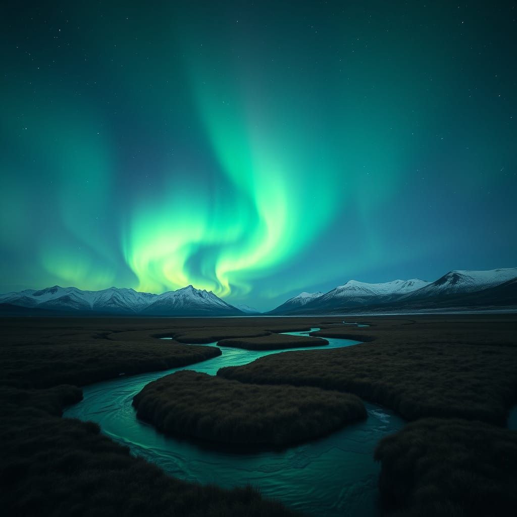 This image showcases a breathtaking night sky filled with a vibrant aurora borealis, casting green and purple hues over snow-capped mountains and grassy terrain. A river reflects the celestial display, creating a sense of wonder and tranquility.