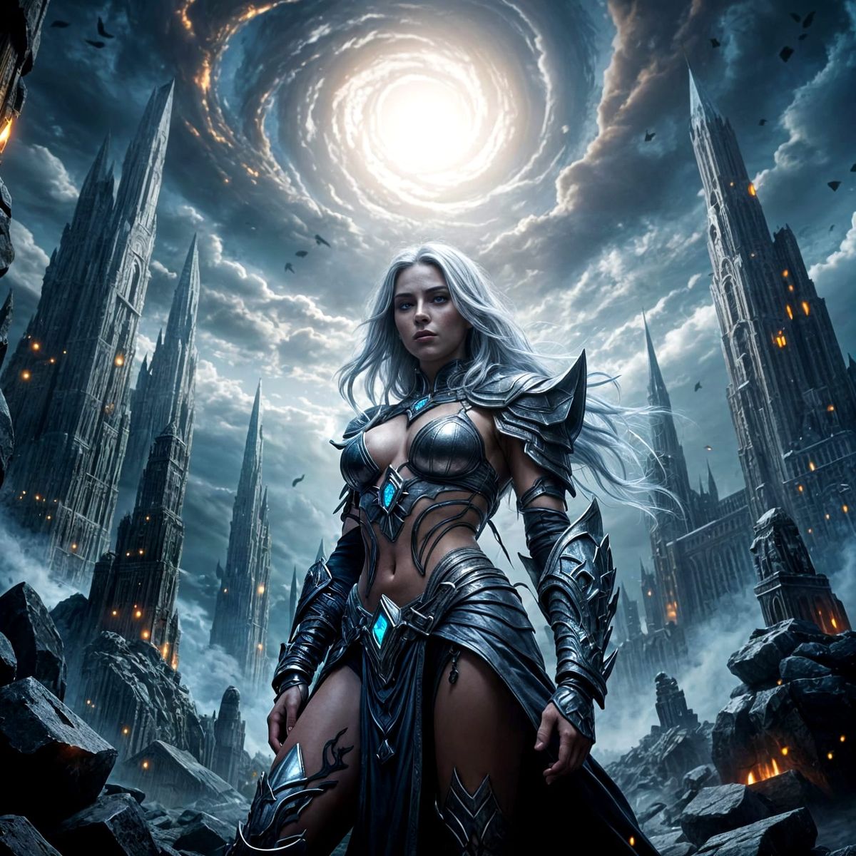 A lone sorceress stands atop a crumbling obsidian tower, her silhouette outlined against a swirling vortex of cosmic energy. Ancient runes glow faintly on the stone, hinting at forgotten power. The scene is rendered in a dark fantasy concept art style, with moody, dramatic lighting casting long shadows ...