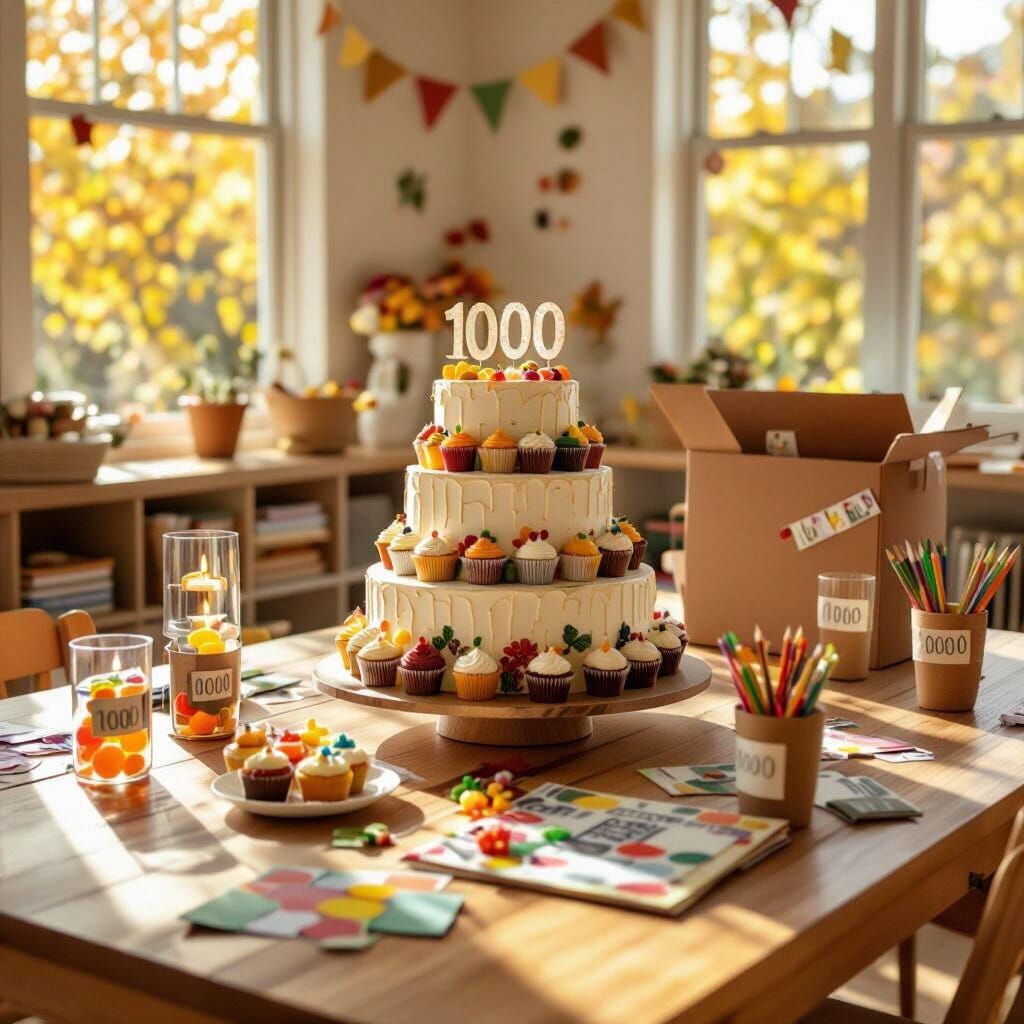 This image depicts a 3rd-grade classroom celebrating the number 1000 with a festive table display. Features warm autumn colors and a Pinterest-inspired aesthetic.