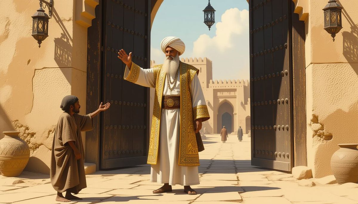 This image depicts a wealthy Muslim nobleman in traditional attire at his palace gate, dismissively waving away a beggar. The scene is richly detailed with dramatic lighting and deep colors, reminiscent of matte paintings.