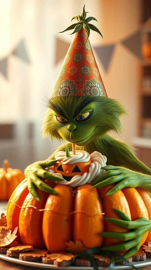 This image shows a photorealistic Grinch character enjoying a fancy pumpkin birthday cake. The scene features Halloween style, golden hour lighting, and ultra-detailed textures for a cinematic feel.