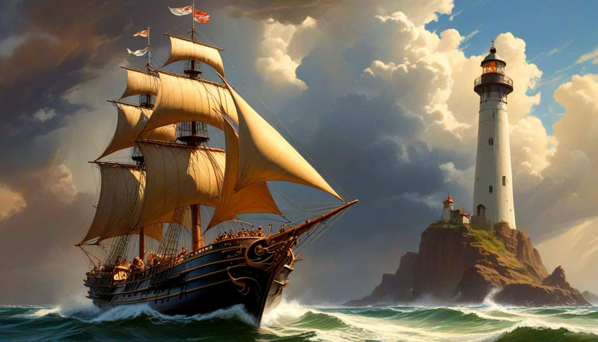 A striking picture of an steampunk sailboat approaching a lighthouse during a storm. The image evokes precisionist art with strong lines and otherworldly elements.