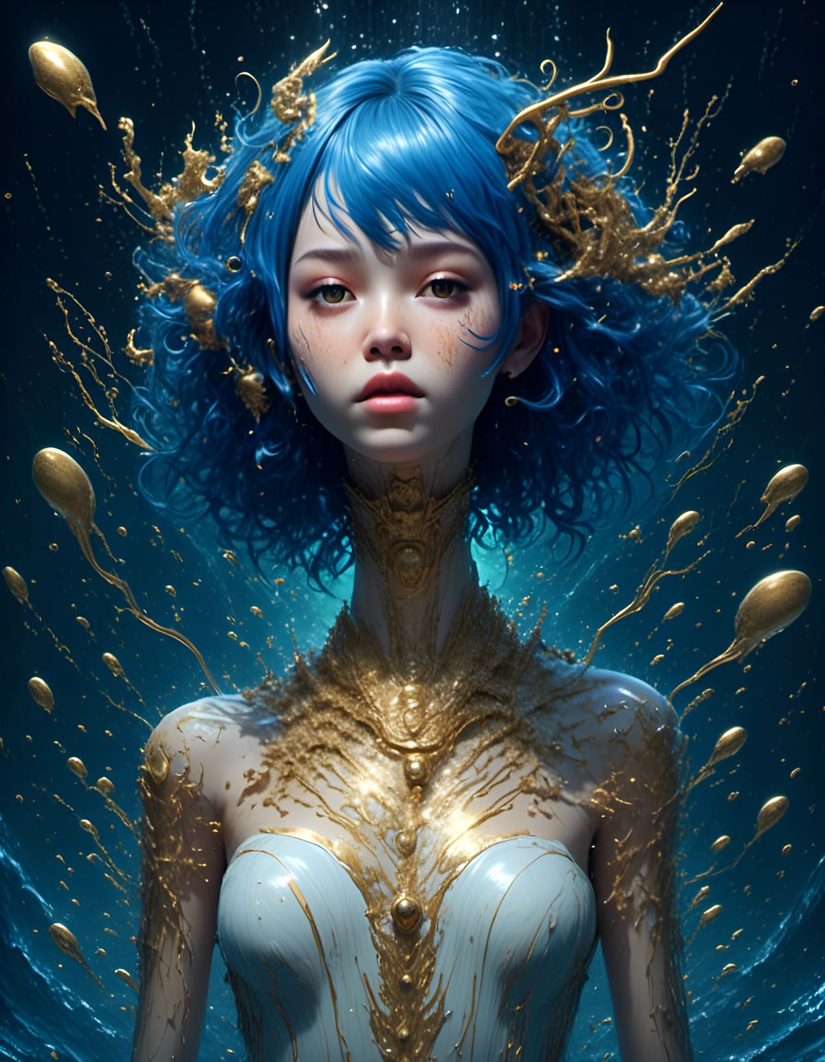A hyperrealistic photograph of a humanoid creature from the Mariana Trench with ultramarine hair and gold eyes. This fantasy art piece features dynamic lighting and an expressive style.