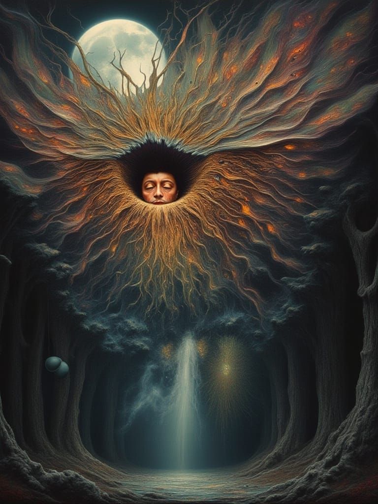 This image shows an athletic man, dressed as a flower and fractured into rainbow butterfly wings, trapped in campfire smoke. Giant glowing flowers dominate a magical landscape under a full moon.