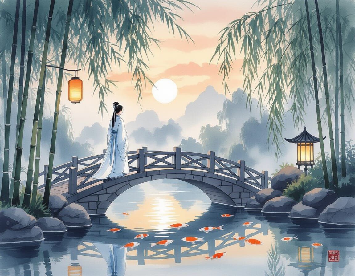 Imagine a serene Chinese garden at dusk, with a koi pond reflecting the soft colors of the setting sun. A lone figure in traditional Hanfu dress stands on a stone bridge, gazing at the water. Delicate bamboo, weeping willows, and lanterns cast a warm glow. Rendered in the style of Qi Baishi, with soft ...
