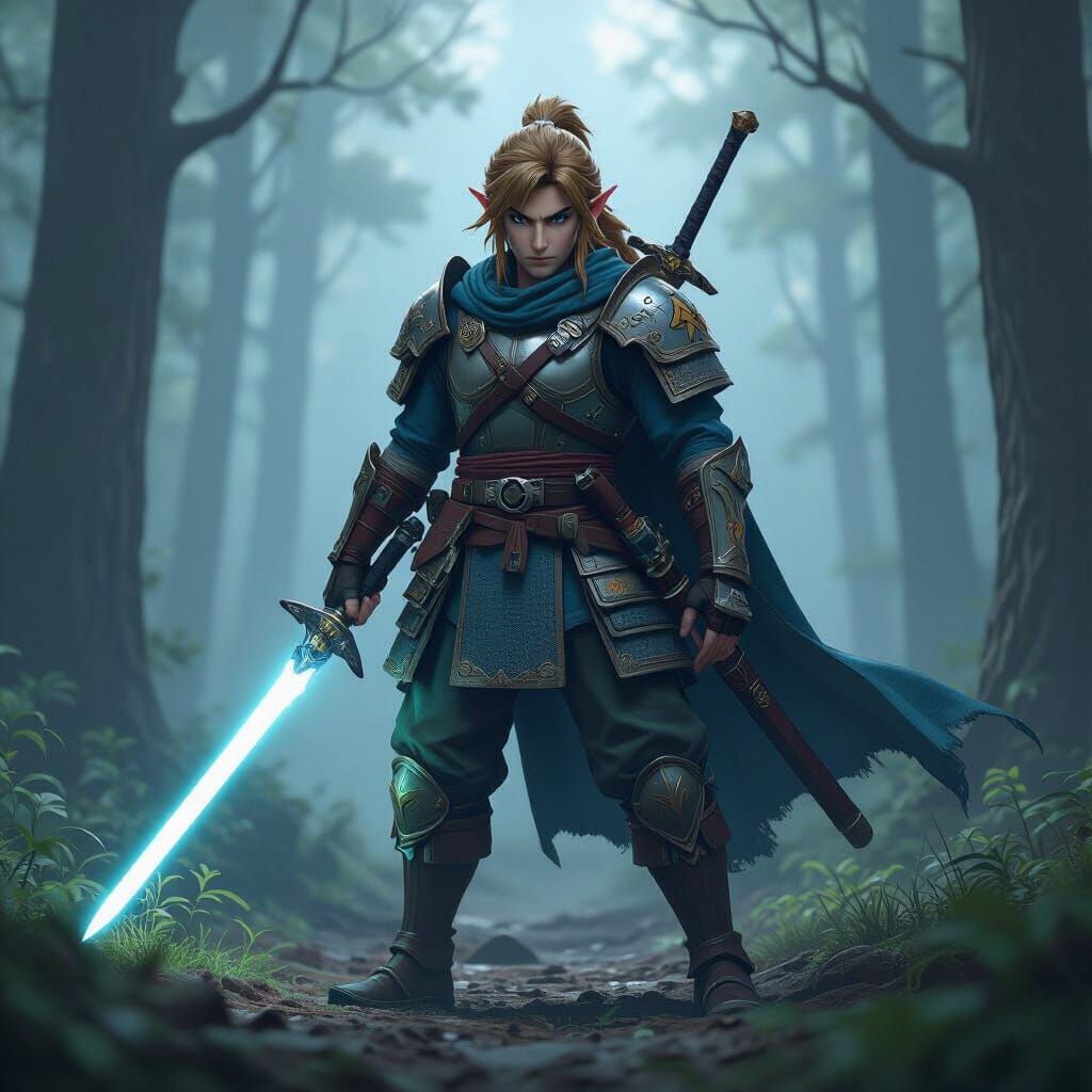 This realistic digital matte painting shows Link in samurai armor with Jedi elements, wielding a lightsaber and master sword in a misty forest. Dramatic lighting and intricate details create a cinematic atmosphere.