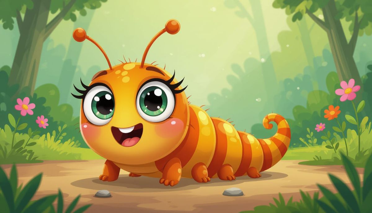 This image shows a vibrant cartoon caterpillar with large, expressive eyes. The character exudes excitement, rendered in a cheerful and inviting style.