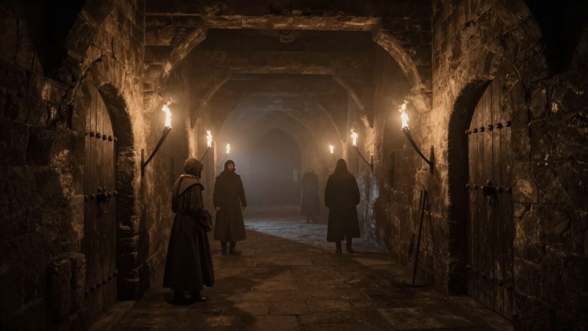 A grim 14th-century dungeon corridor with flickering torchlight and dramatic shadows. Misty air and rough stone walls create a somber, historical atmosphere. Rendered with cinematic lighting and desaturated tones.
