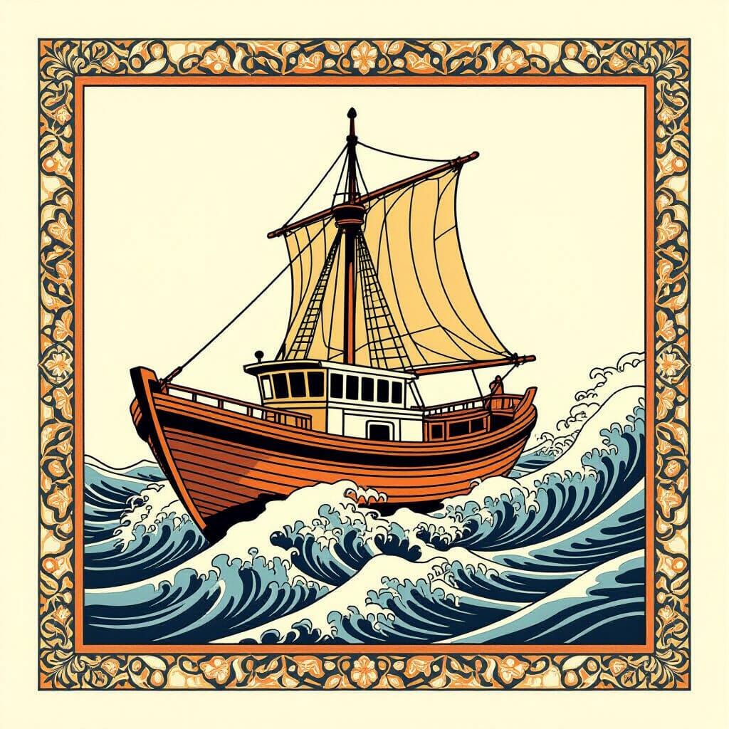 A monochromatic sepia image of a stylized boat, reminiscent of Japanese woodblock prints. Features decorative borders and a simple cream background, evoking refined ukiyo-e art.