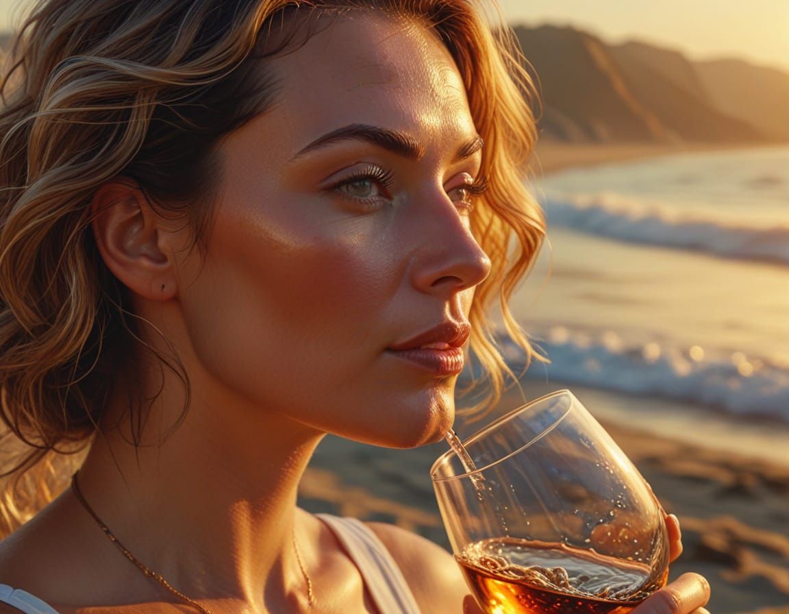 This image shows a Russian woman in her thirties drinking wine on a beach, depicted as a vivid digital painting. The close-up shot features golden hour lighting and soft waves, with a warm, triadic color palette.