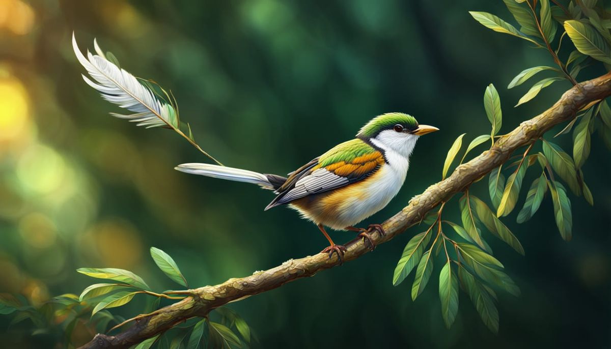 This image shows a white-tipped plantcutter perched on a branch. The digital painting style highlights the vibrant feathers and intricate branch details. Warm light illuminates the lush, high-contrast background.