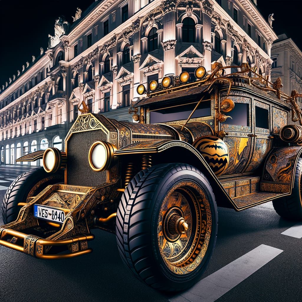 This image shows an ornate utility vehicle parked at night in a city with classical Viennese architecture. The vehicle's intricate details and embellishments are inspired by Art Nouveau.