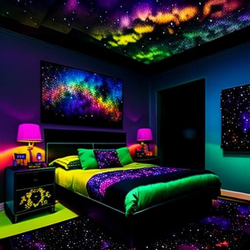 This image shows a maximalist child's bedroom with glowing, starry night-sky walls and colorful furniture. The vibrant, saturated scene is rendered in an ornate, dramatic, art deco aesthetic.