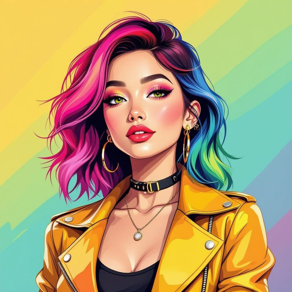 This image showcases a woman with vibrant rainbow hair and a trendy outfit. The artwork features bold lines, lively textures, and a playful aesthetic, reminiscent of modern digital art.