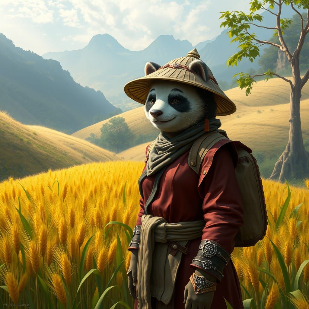 A striking picture of a female pandaren in traditional Chinese farmer's clothing amid golden wheat fields. This fantasy art evokes a serene and realistic landscape.