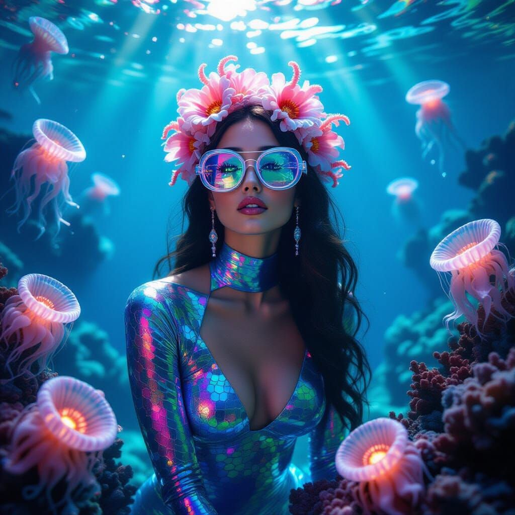 A vibrant, iridescent mermaid in a coral reef environment with fiber-optic anemones. This image features dancing caustic light and bioluminescent elements in a psychedelic pop art style.