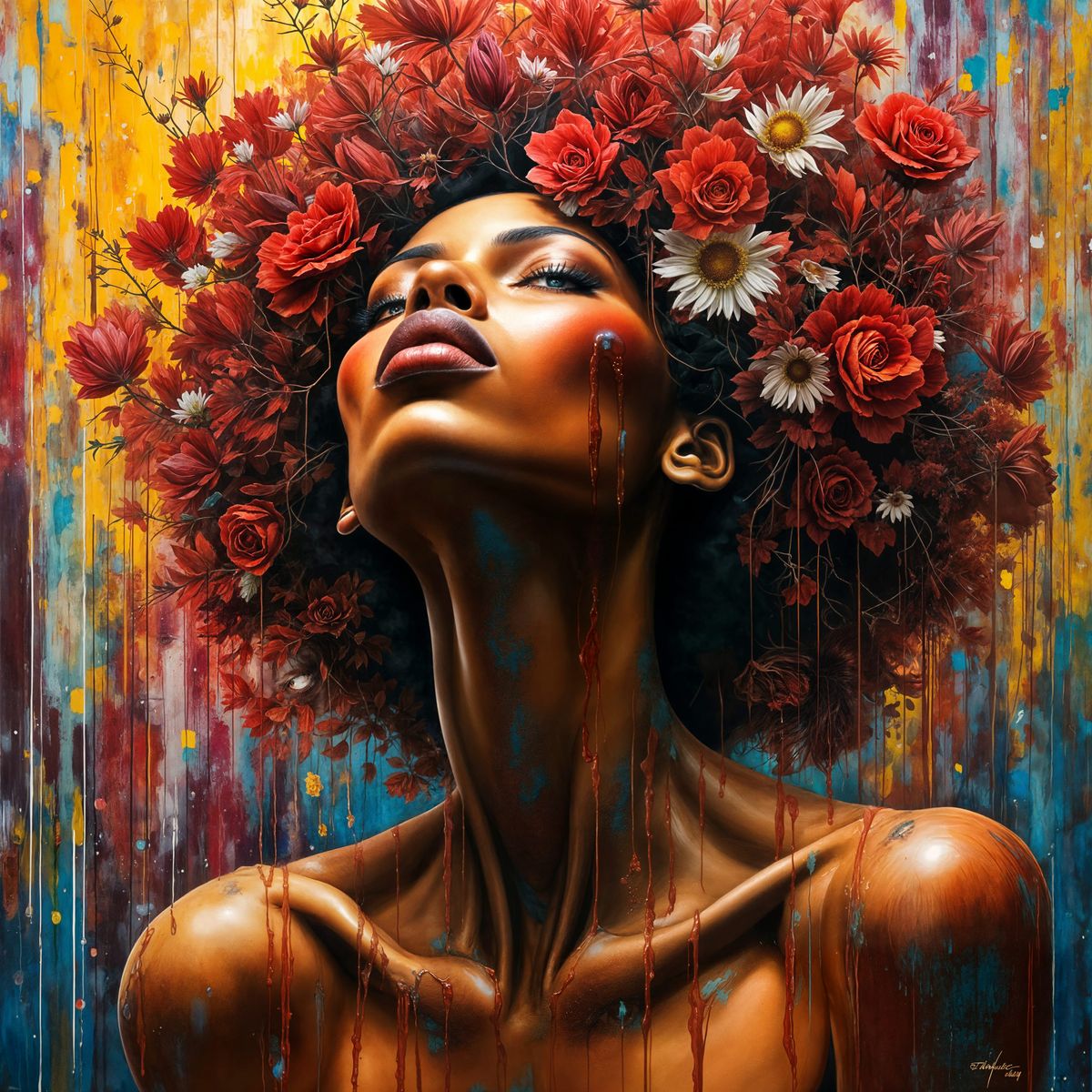 A striking portrait of a Black woman with red hair and floral accents. The image features vibrant paint drips, bold brushstrokes, impasto textures, and high-contrast lighting in a melancholic artistic style.