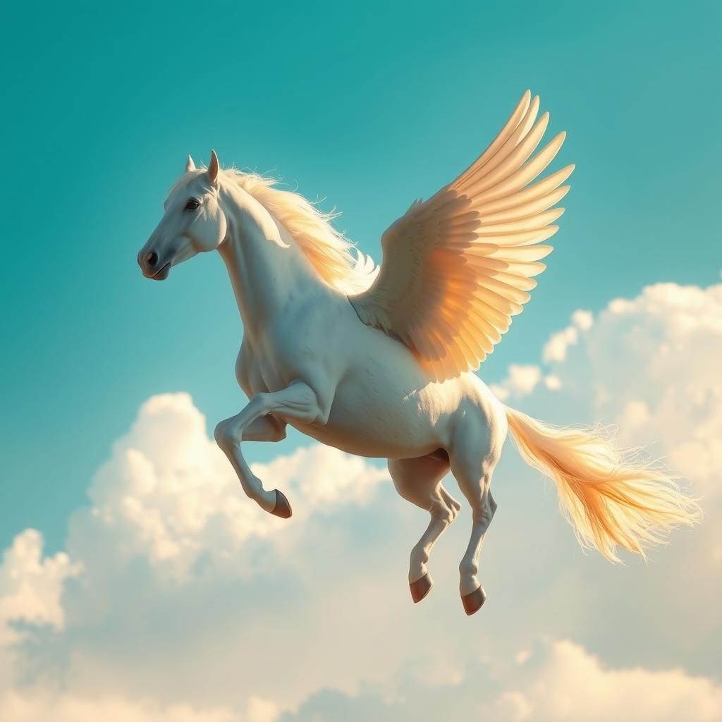 A striking picture of a white winged horse flying through a blue sky. The image has an ethereal quality, reminiscent of dreamlike fantasy art.