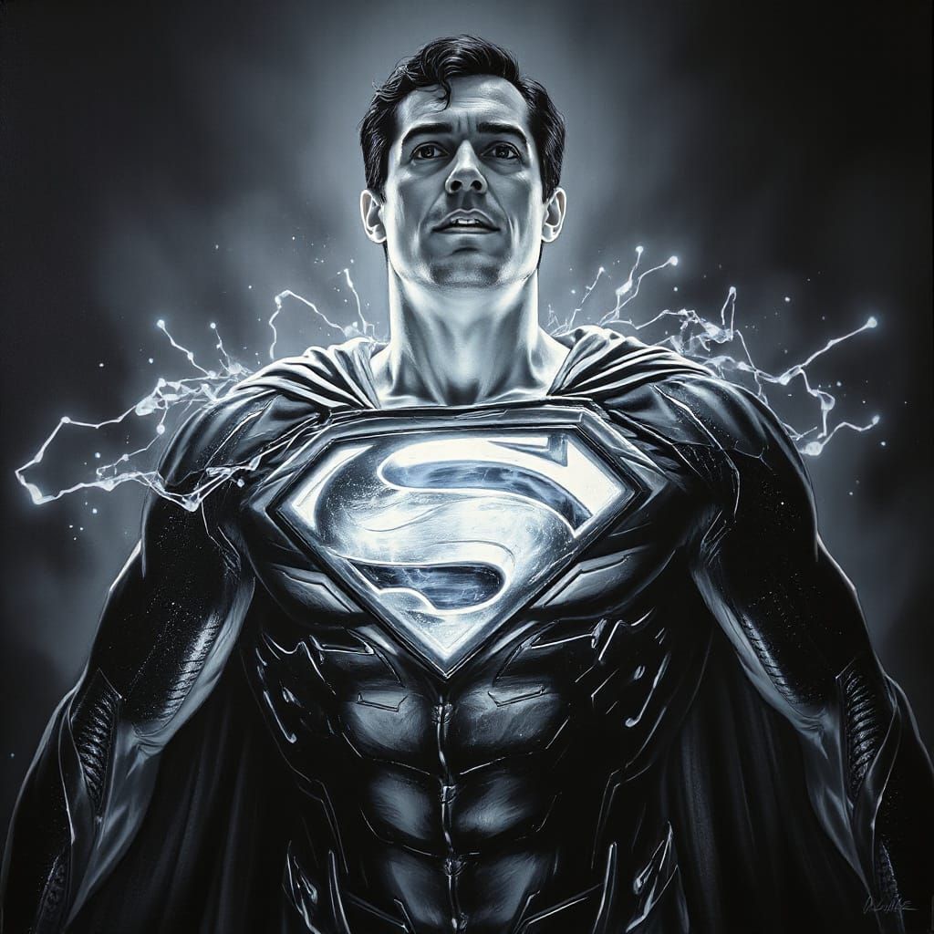 This image shows Superman rendered in black and white with bioluminescent accents. The artwork has been created as an oil painting.