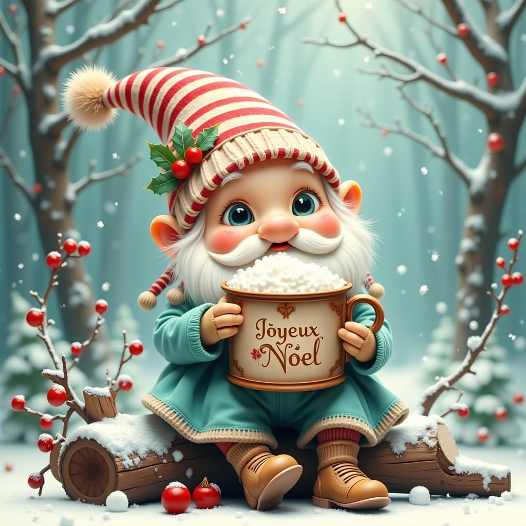 This image shows a joyful gnome with a white beard, wearing a festive aquamarine winter outfit and hat, holding a large cup of hot chocolate. Digital painting in a charming storybook style with soft, warm lighting.