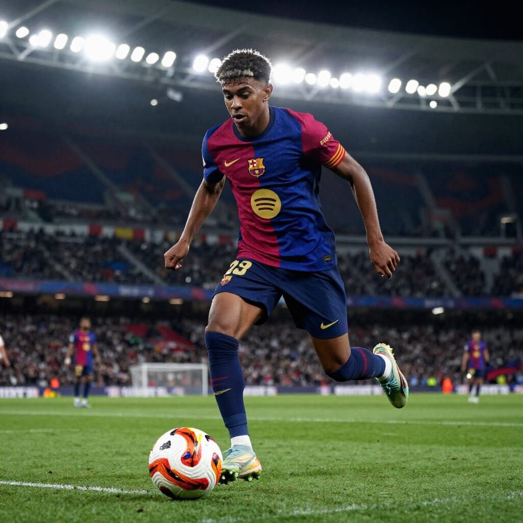 This image captures Lamine Yamal in a dynamic action shot, dribbling a soccer ball during a match. Photorealistic style with dramatic lighting and sharp focus.