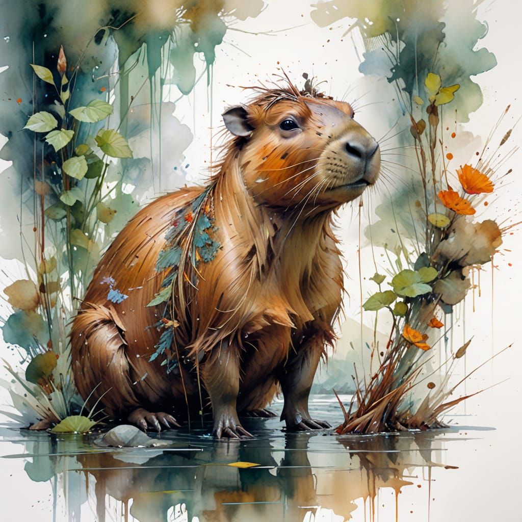 This image shows a large capybara resting in calm water, embodying gentle nature and aquatic adaptability. It is rendered in a stylized watercolor with splashy white space.
