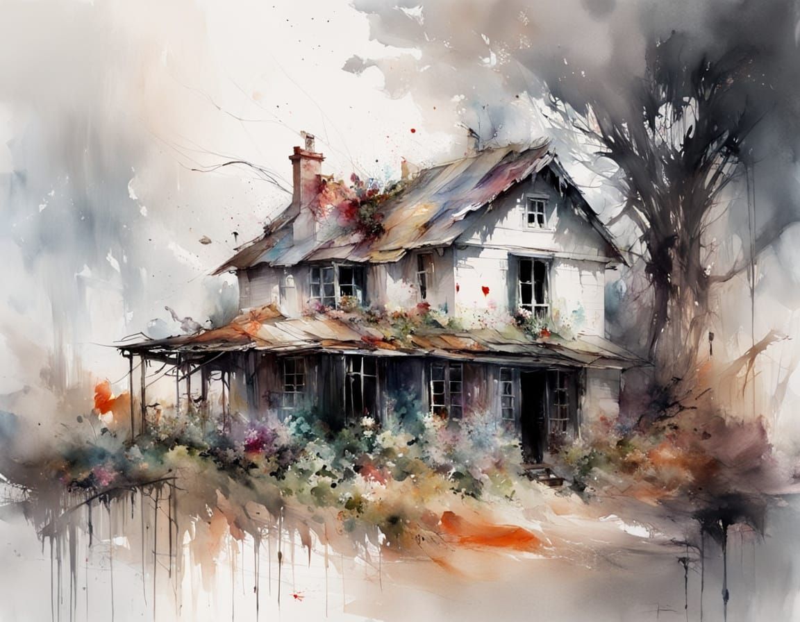 A watercolour painting of an abandoned crooked cottage in a surreal and ethereal style. The artwork features delicate, expressive techniques with cinematic stylization and splashy white space.