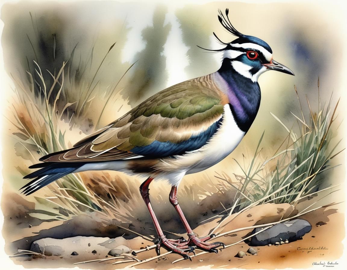 A delicate watercolor painting of a lapwing in its natural habitat. The artwork evokes a sense of realism and naturalism reminiscent of classic wildlife illustrations.